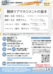 保健福祉センターの保健師さんによる難病支援制度のお話しと、パネルディスカッションを通してケアマネジメントの展開や専門職間連携など押さえておきたいポイントを学びます。